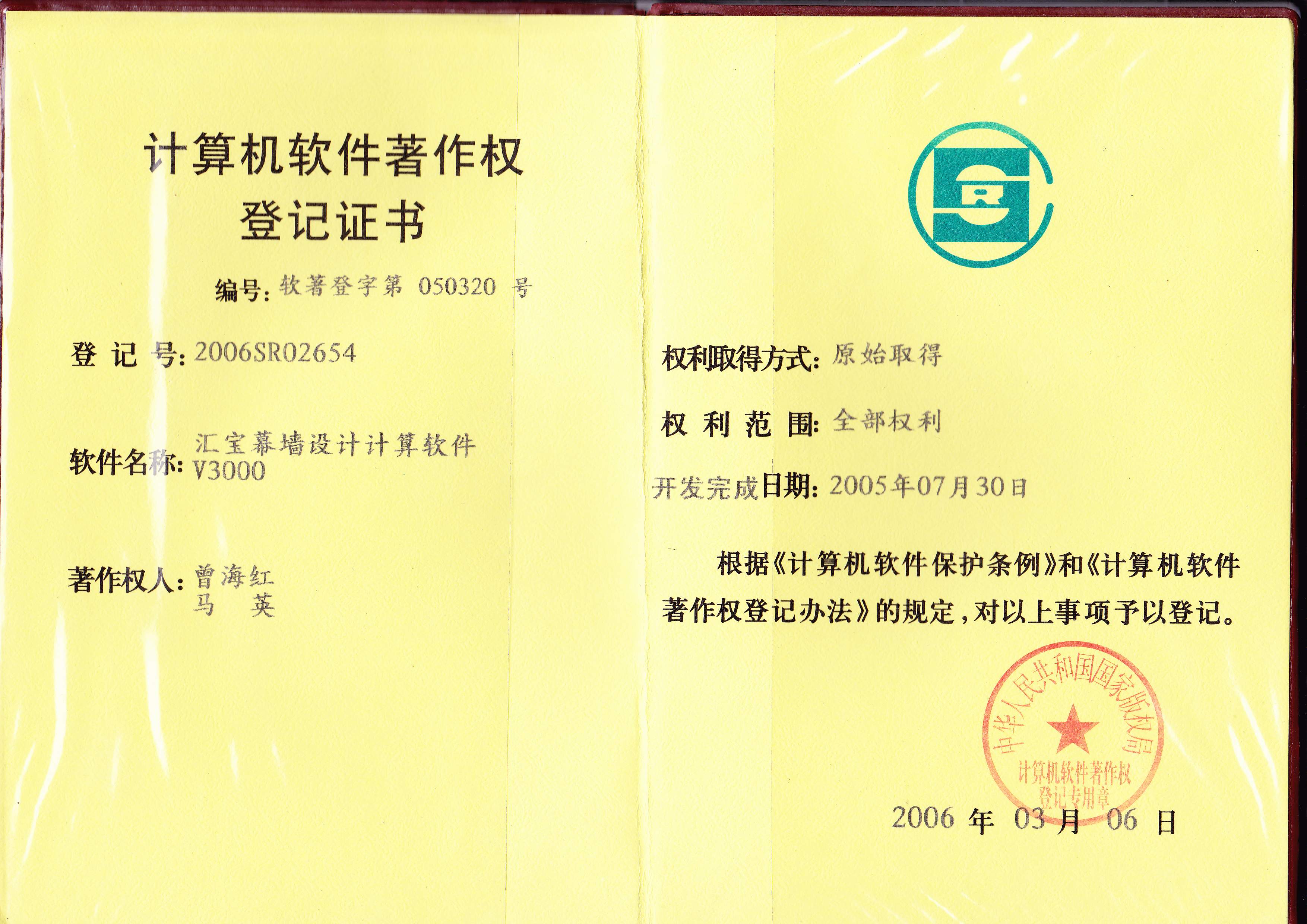 汇宝幕墙计算软件早已取得了国家版权局颁发的《软件著作权登记证书》,编号是:“软著登字第050320号”,登记号为:2006SR02654。版权可以到国家版权局官网查询:http://www.ccopyright.com.cn